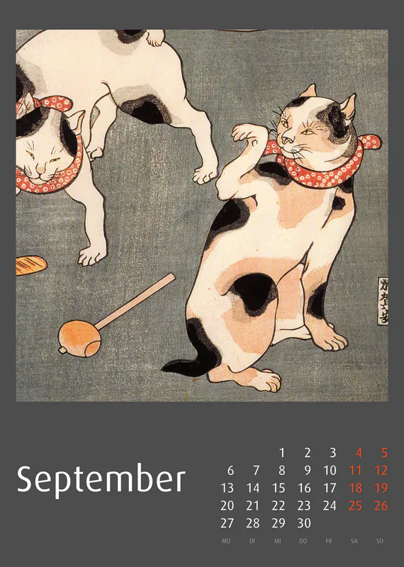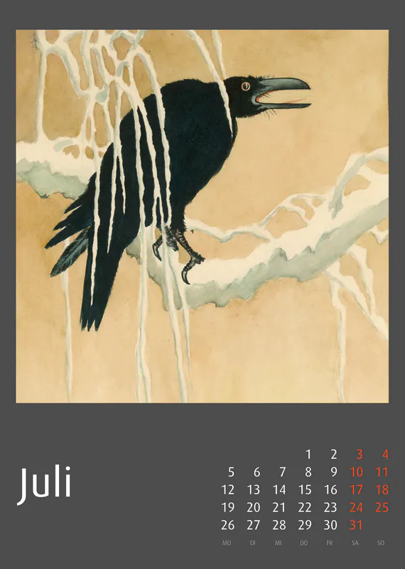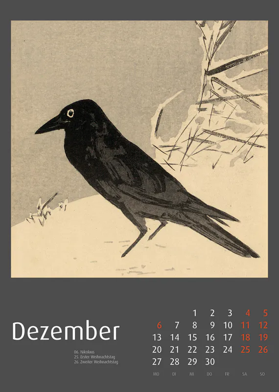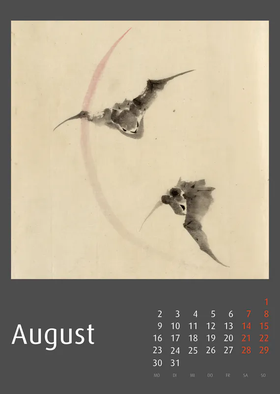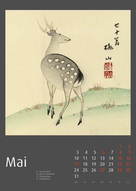 Im Lauf des Jahres wechseln sich spielerische Szenen (etwa Katzen in Bewegung) mit stillen Naturbeobachtungen ab: ein Vogel im Schnee, ein dunkler Rabenvogel, ein Hirsch in weiter Fläche oder ein Insekt zwischen Blättern. Genau diese Mischung aus Stilisierung und genauer Beobachtung macht den Reiz japanischer Tierdarstellungen aus.