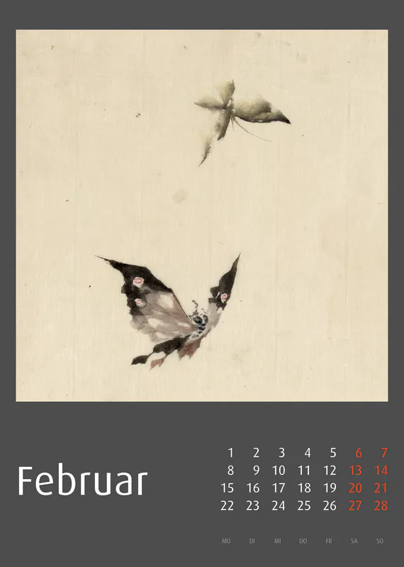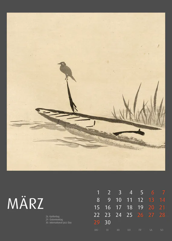 Dieser Kalender zeigt Tiere, wie sie in japanischen Farbholzschnitten und Naturstudien erscheinen: konzentriert beobachtet, grafisch reduziert, oft mit viel Leerraum und feinen Details. Katzen, Vögel, Frosch, Hirsch und Insekten treffen auf Pflanzen, Zweige und Texturen – mal verspielt, mal still, immer mit klarer Komposition. Die Motive funktionieren als ruhige Wandbilder: zarte Farben, kräftige Tuscheflächen, feine Linien – und ein moderner Kalenderteil, der das Bild nicht erschlägt. Diesen Kalender gibt es in den Formaten 30 x 45 cm und im kleineren 20 x 40 cm Format.