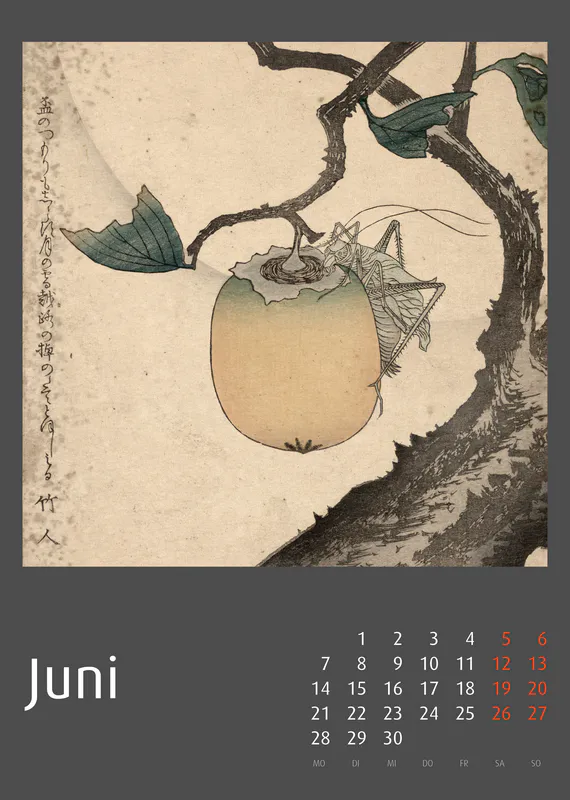 Tierdarstellungen aus japanischen Farbholzschnitten sind oft so komponiert, dass sie auch als Ausschnitt funktionieren: viel Bildraum, ein klarer Schwerpunkt, wenige Elemente – und dennoch Details, die man beim zweiten Blick entdeckt. Genau deshalb eignet sich diese Bildwelt besonders gut für einen Wandkalender: ruhig, grafisch, zeitlos.