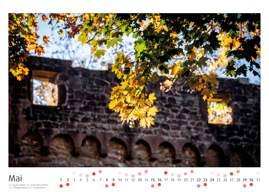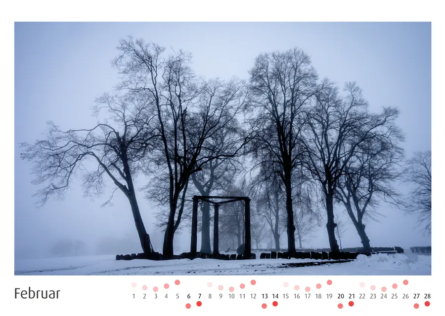 Der Kalender „Odenwald 2027“ von Frank Schindelbeck zeigt den Odenwald als ruhige, weit aufgefächerte Kulturlandschaft zwischen Waldkanten, Tälern, Streuobstwiesen und markanten Höhenzügen. Die Serie lebt vom Wechsel der Jahreszeiten und vom Licht: Winterliche Reduktion und Nebel treffen auf sattes Grün, klare Sommerabende und dichte Waldstrukturen. Statt Postkartenpathos stehen Bildruhe, präzise Komposition und Atmosphäre im Vordergrund – mal aus der Distanz mit weitem Blick, mal nah an Details wie Moos, Wurzeln und Wasseroberflächen. Burgen- und Ruinenmotive fügen eine kulturgeschichtliche Ebene hinzu, ohne die Naturwirkung zu überdecken. Dieser Odenwald-Kalender ist kein dekoratives Beiwerk, sondern eine zusammenhängende fotografische Serie – landschaftlich, klar und bewusst unaufgeregt, im großen Format gedacht.